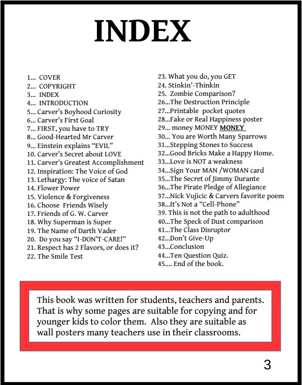 Carver did NOT invent peanut butter, but he did understand how to live a life of love! This book does NOT cover all of Carvers life... or his inventions. Many other books have covered those subjects sufficiently. This PDF e-book covers his faith in God and his philosophy of hard work and loving others. Suitable for junior, or high school age kids. Adults also will find this interesting. You don't have to read the 25 books I own (about Carver), to discover the SECRETS he figured out! Just read the 44 pages of this e-book! He is a great hero, but he is not the only subject of this book. The purpose of this book is mainly to help the troubled youth of America. George Carver knew some little known "secrets" about how to live a life of love and forgiveness. Using Carvers ideas about love and forgiveness and hard work is a starting point to mention other sources of wisdom too. Albert Einstein is quoted, and other famous people are also mentioned. All for the purpose of helping students who have negative attitudes, laziness, or poor behavior. This book would be helpful for any teacher or parent trying to reach a troubled youngster.